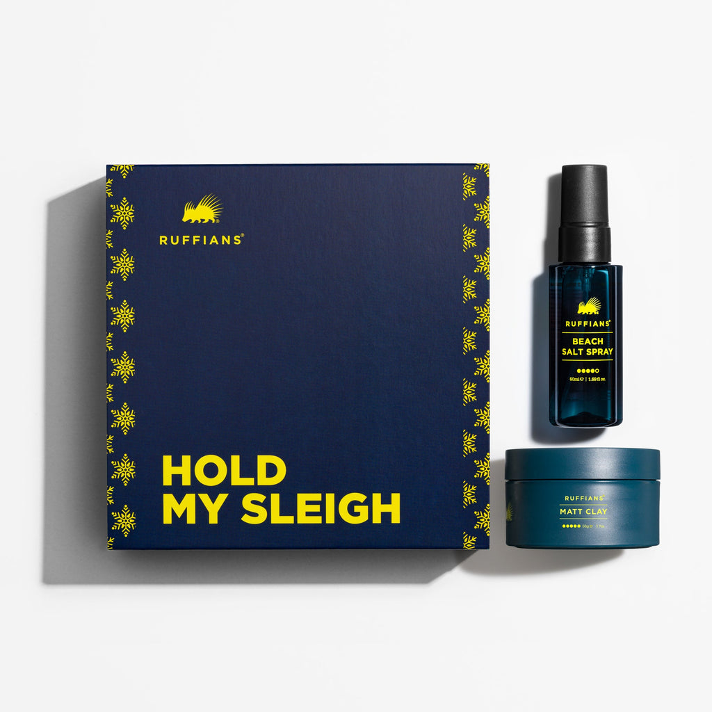 Beard care product set with a dark blue box labeled 'Sleigh the Beard' on a white background.